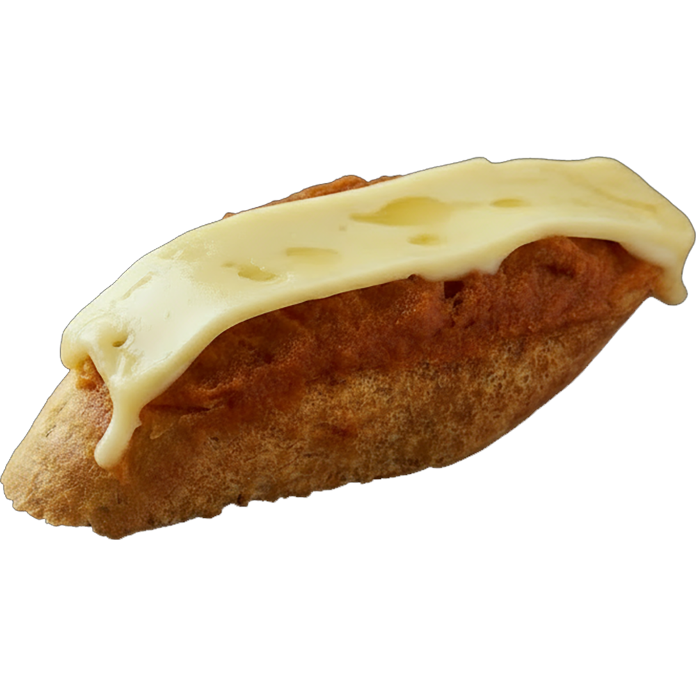 Pan, kanikama, mayonesa, camarón y huevo de codorniz.